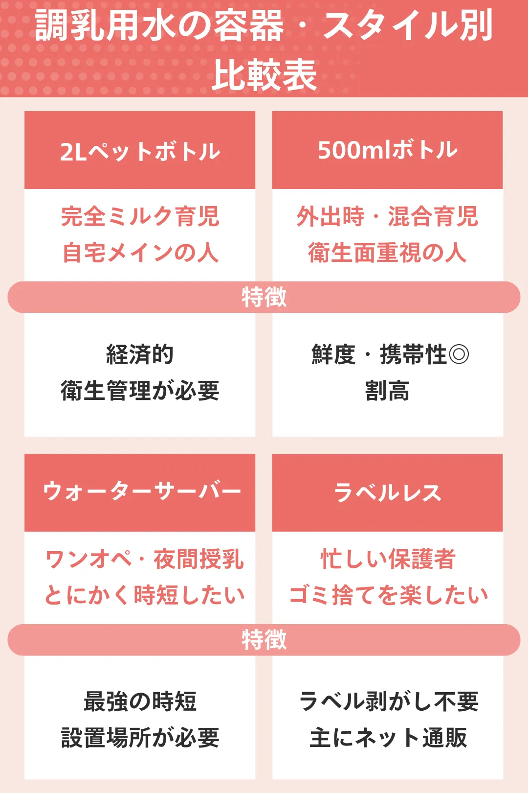 「新生児の内臓への負担を極限まで減らしたい」「毎日のことなのでコストと手間を抑えたい」などの優先順位を明確にすると、選ぶべき商品は自然と絞られてきます。