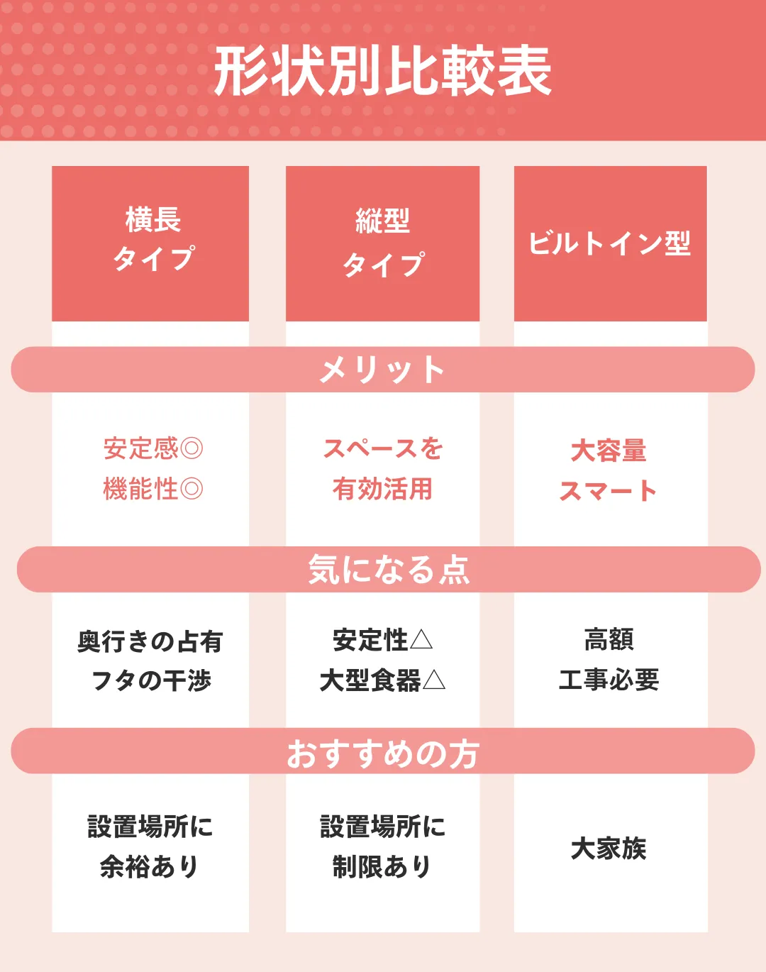 - 家族構成と食器の量に合わせた容量と設置スペースに適した形状