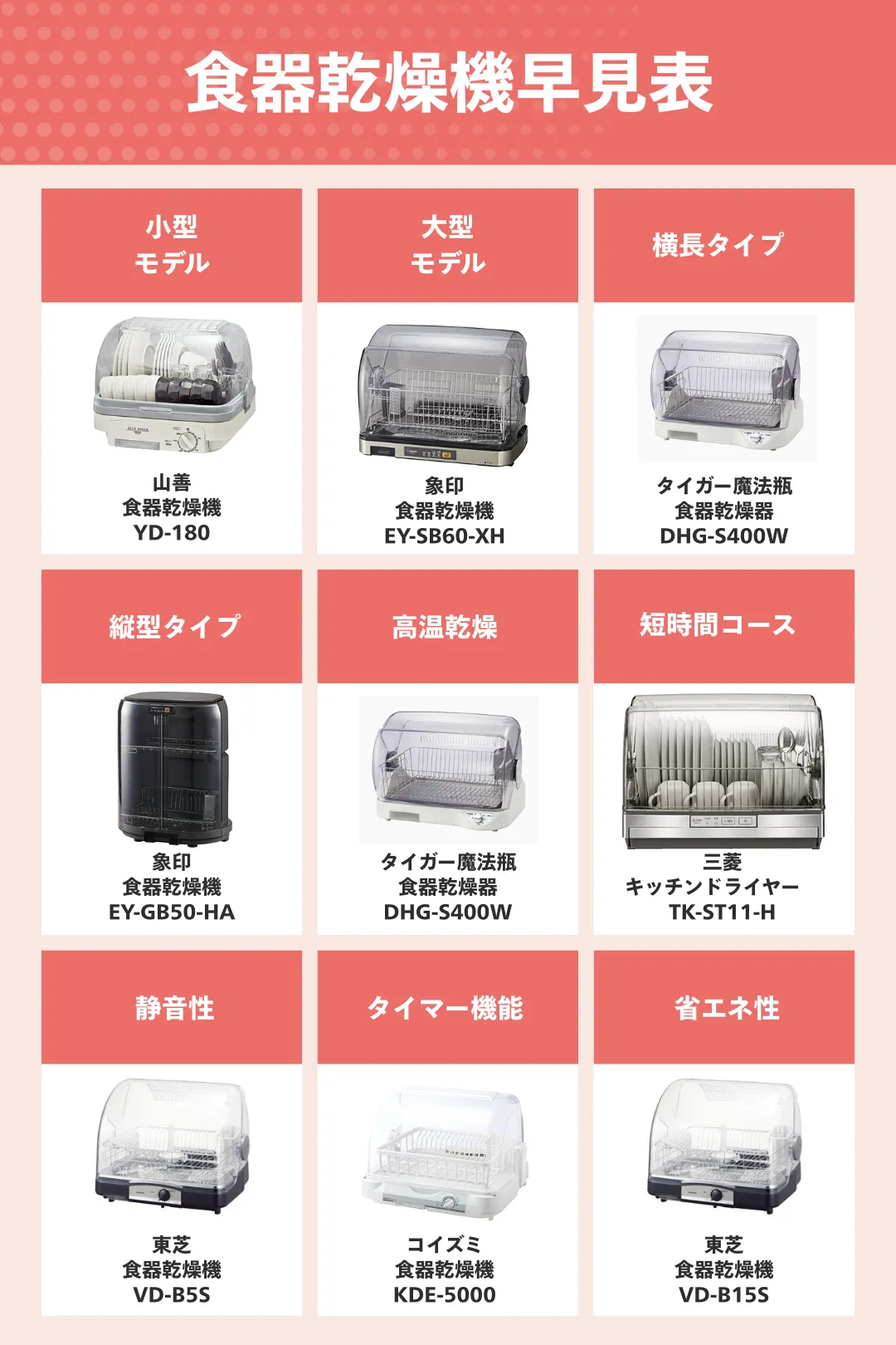 「夜間にまとめて乾燥させたいので静音性が欲しい」「狭いキッチンに置きたいので縦型スリムが良い」「アレルギー対策で徹底的に除菌したい」「手入れの手間を省きたいので水が自動で流れるものが欲しい」などの使用目的や状況を明確にすると、選ぶべき商品は自然と絞られてきます。