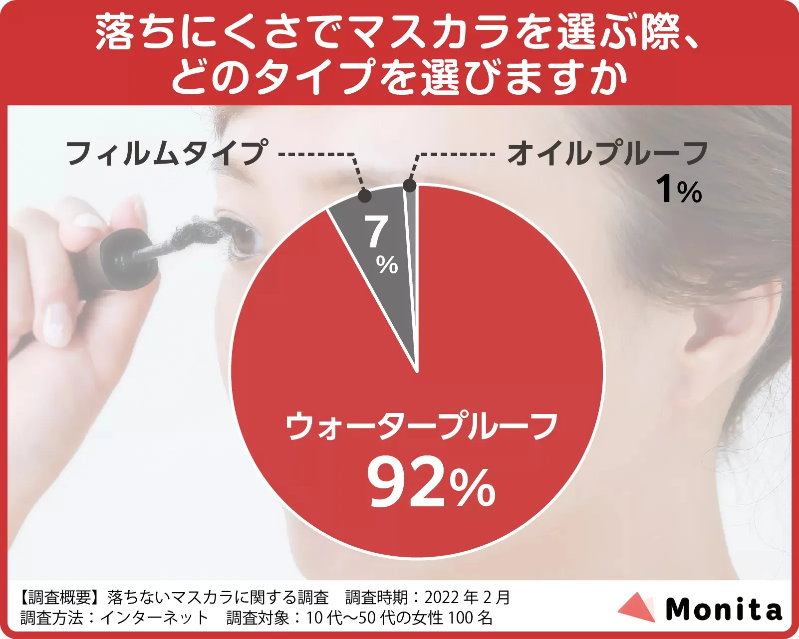 今回のアンケートではまず落ちにくいマスカラを検討するときに選ぶタイプについてお伺いしています。その結果「ウォータープルーフ」が92%と圧倒的1位で、2位は「フィルムタイプ」で7%と大きな差がついた結果となりました。