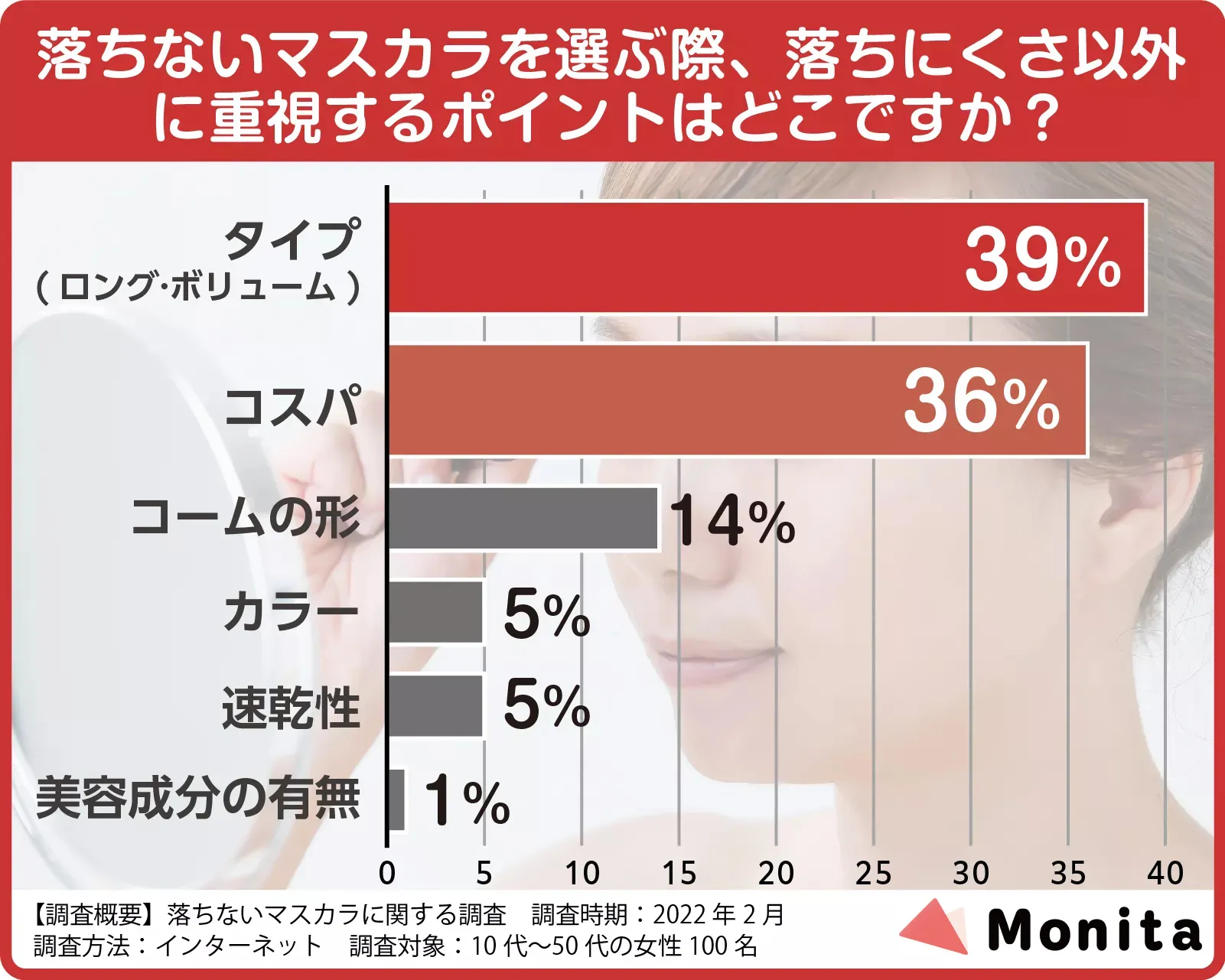 次にアンケートでは落ちにくさ以外に重視するポイントについてお伺いしました。その結果1位は「ロング・ボリュームなどの仕上がり」で39%、次いで「コスパ」が36%と僅差で2位に入っています。