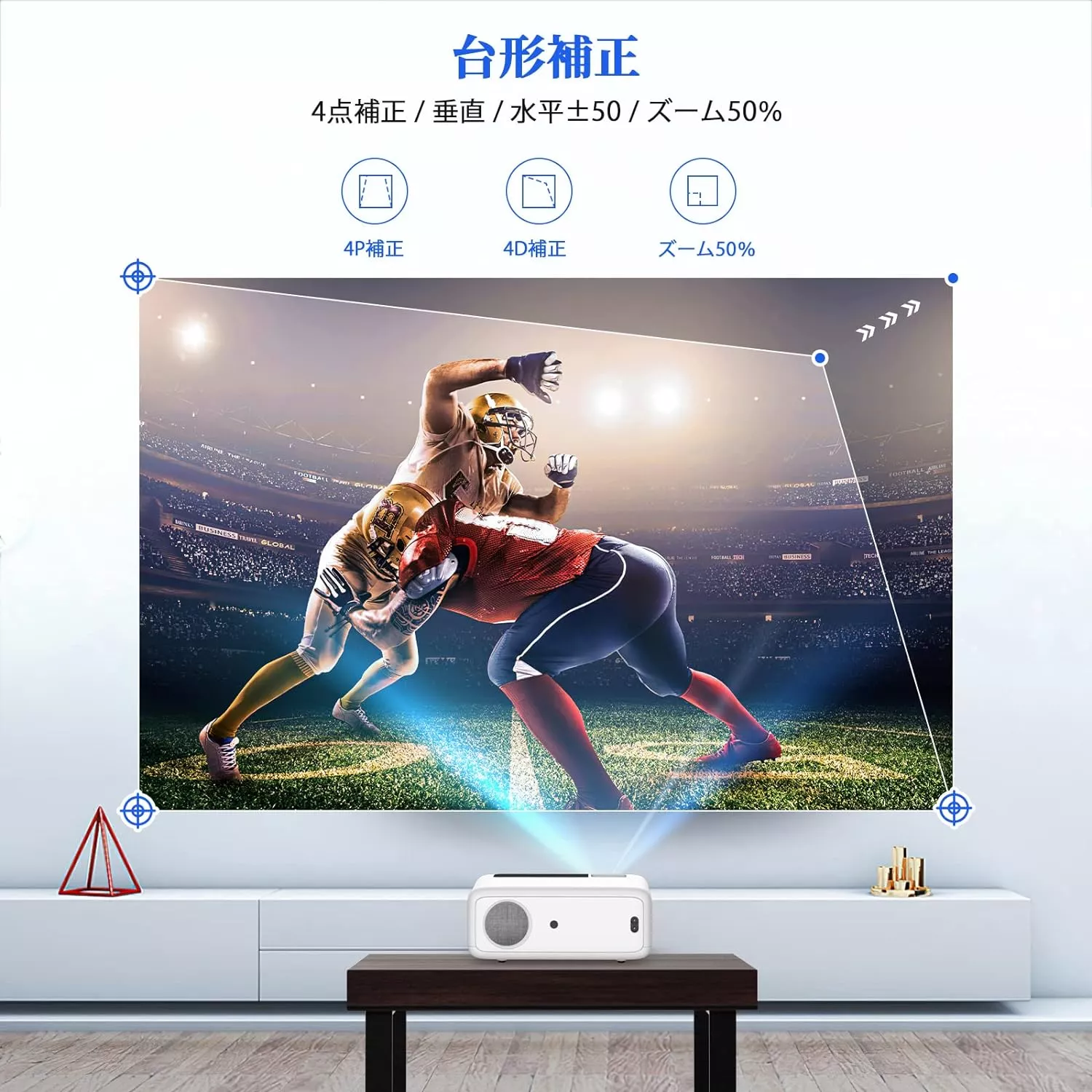台形補正機能には、水平・垂直の2種類があり、ほとんどのモデルが垂直方向に対応しています。水平方向にも対応できるモデルなら、壁に対し斜めの方向からも投影できるため、壁との距離を取るのが難しい場合に有効です。