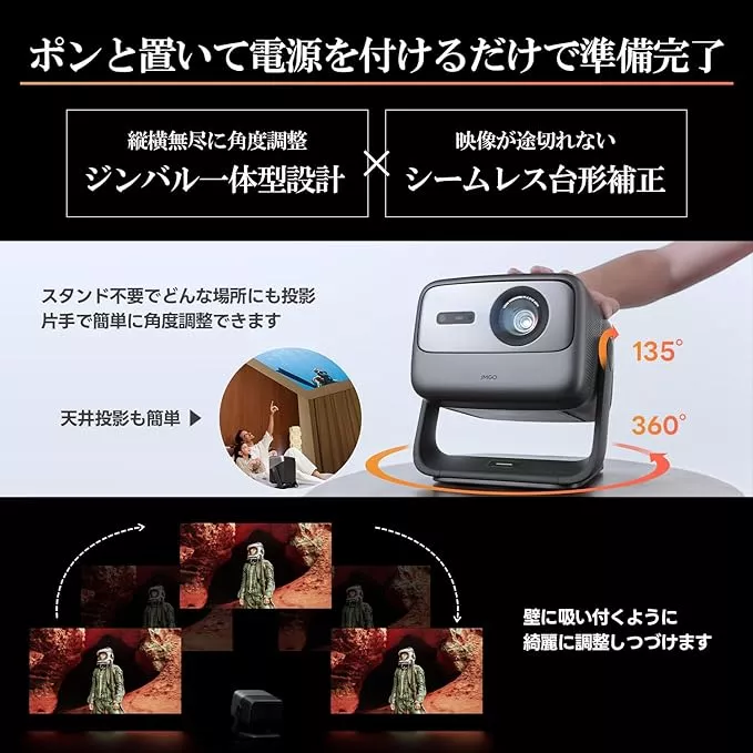 - 機能:Bluetoothスピーカー内蔵、Android TV搭載、2.5時間バッテリー内蔵、135度角度調整機能、台形補正機能、投写オフセット