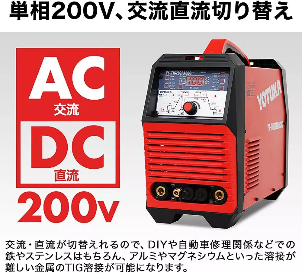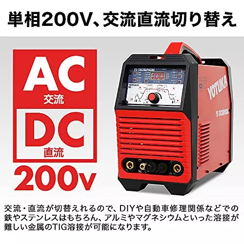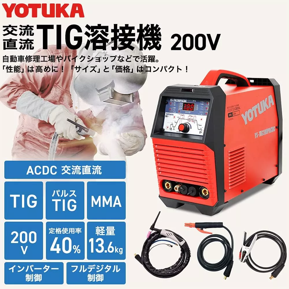 YOTUKAのTIG溶接機 YS-TIG200Pは、インバーター制御とパルス機能を搭載した5.5kgの軽量モデルです。100V/200Vの兼用で、TIG溶接・パルスTIG溶接・MMA溶接の3つの溶接に対応できます。