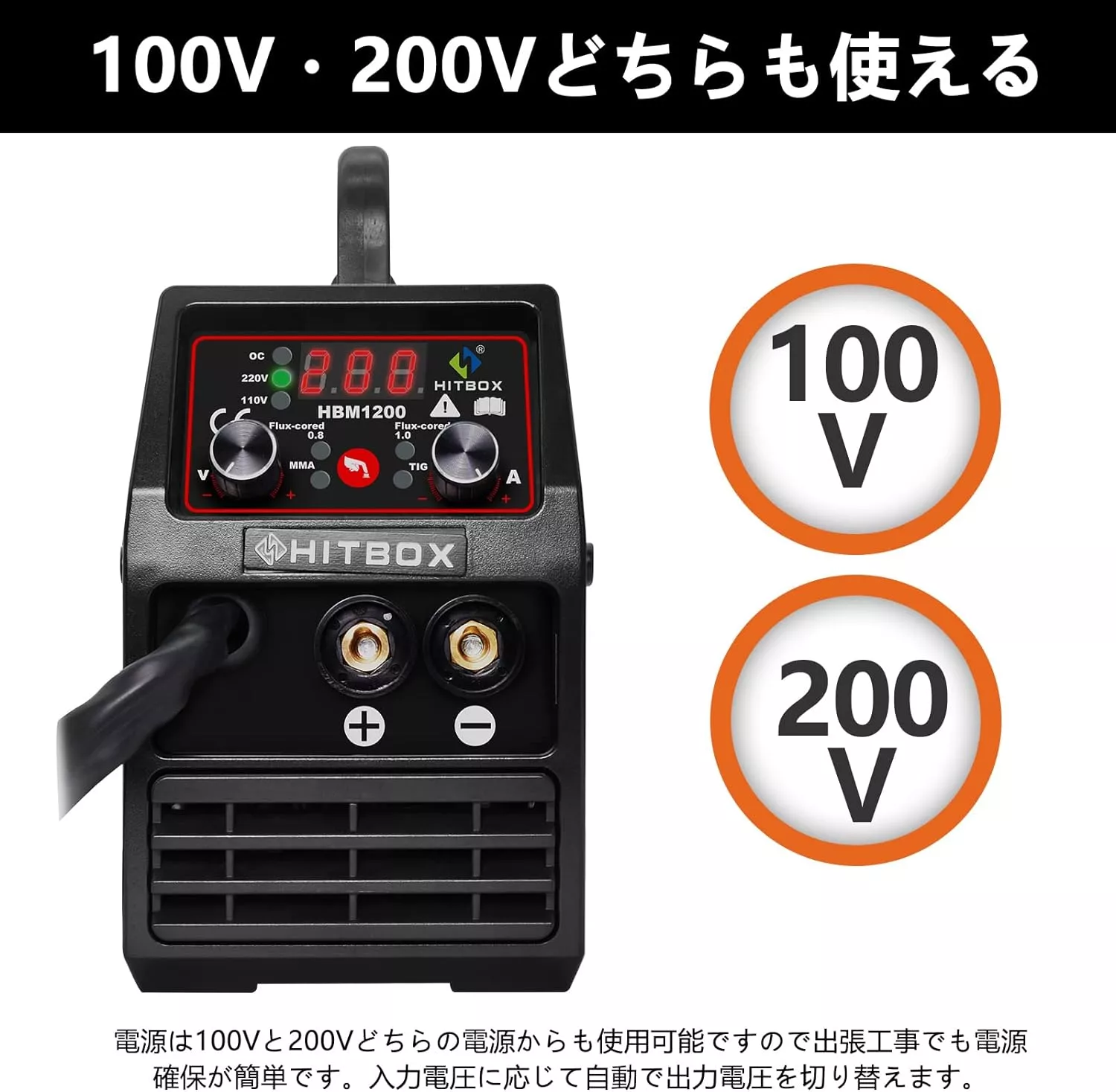 HITBOXのTIG・MIG 溶接機 HBM1200は、100Vと200Vの兼用なのでDIY作業など家庭でも使用できるマルチ溶接機です。これ1台でノンガス溶接・手棒溶接・リフトTIG溶接の3つの溶接方法でさまざまな用途に対応できます。