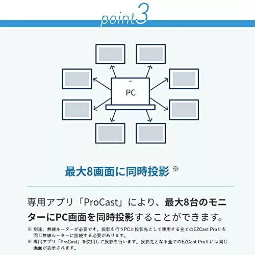 多くのワイヤレスディスプレイアダプターは1対1関係のミラーモード表示ですが、中にはプリンストンの「EZ CastPro II」などのように複数台のミラー表示や分割表示ができる製品もあります。