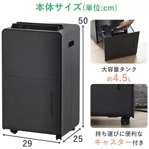 タンクは半透明で、除湿の様子が一目で確認でき、約450mlの水を溜めることができます。4.5畳までのスペースに最適なこの除湿機は、カビや結露の対策に効果的です。