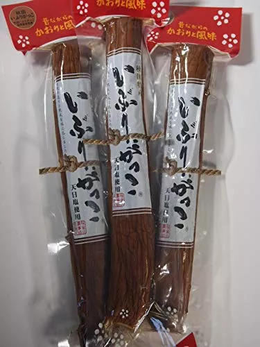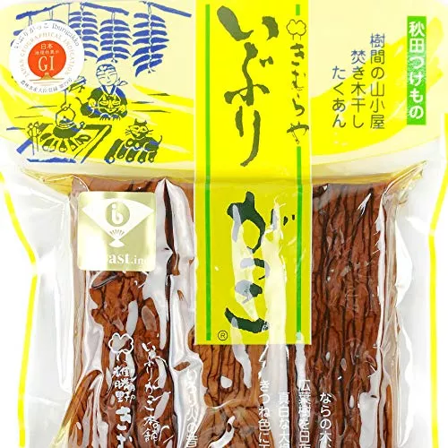 昔ながらの製法にこだわったいぶりがっこで、熟成した風味・薫煙の香り・パリパリとした食感が特徴です。保存料や調味料(アミノ酸等)無添加で、燻製度合いが高く、赤ワインやウィスキーなどにもよく合います。