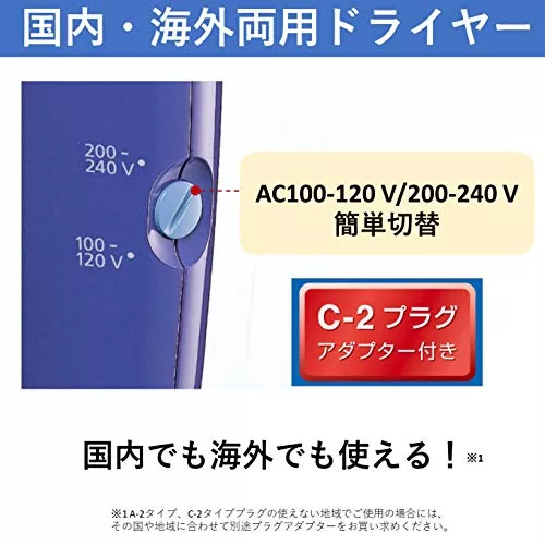 こちらは電圧切替可能でC-2プラグアダプター付きの海外対応ドライヤーです。コンパクトながら風量が1.1㎥分もあるターボドライも採用しています。折りたたみ式で軽量なため持ち運びもしやすいです。
