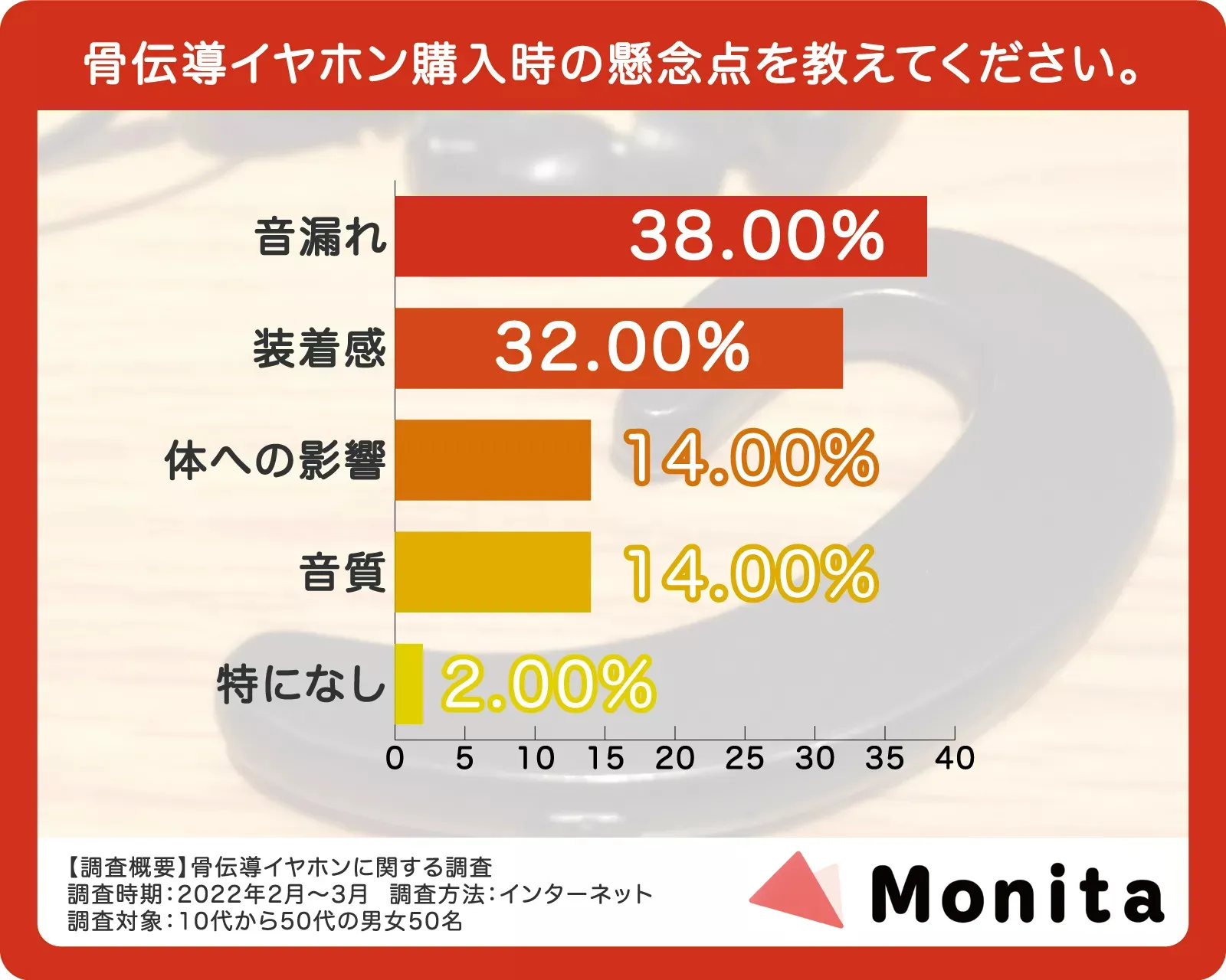 骨伝導イヤホンは骨を振動させて音響を響かせ、聴覚神経に伝達する仕組みになっています。耳を塞がないため周囲の音がよく聞こえますが、その反面、音漏れがしやすいのがデメリットです。アンケートにおいても全体の38%の方が音漏れを懸念していました。