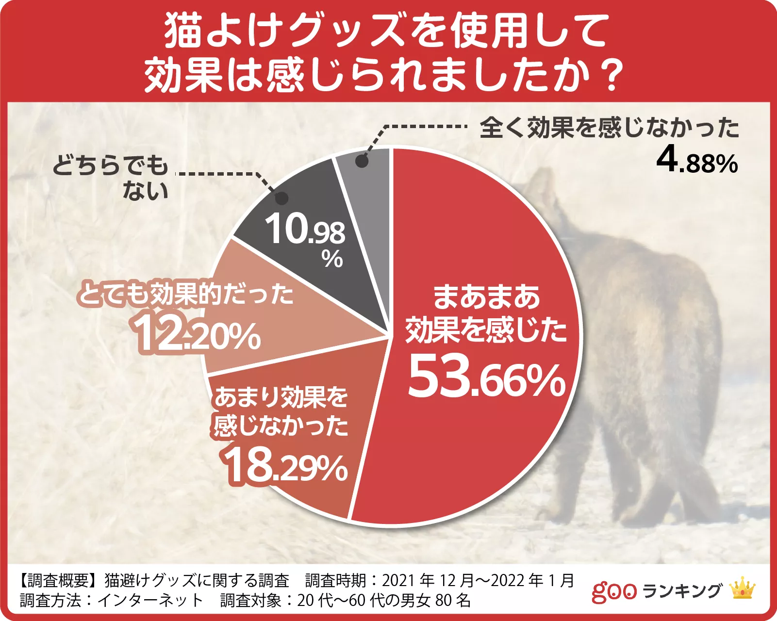 今回のアンケートでは猫よけグッズを使用した経験がある80人を対象に、猫よけグッズに効果があったかどうかを質問しています。その結果「とても効果的だった」「まあまあ効果を感じた」と感じた方が合わせて6割以上にのぼりました。