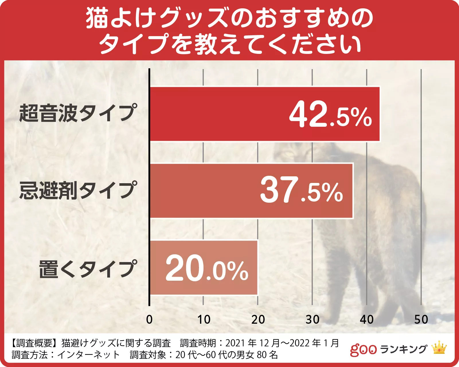 ひと口に猫よけグッズといっても、超音波タイプ・忌避剤・置き型タイプなどさまざまな種類があります。アンケートでおすすめのタイプについて質問したところ、4割以上の方が「超音波タイプ」の猫よけグッズを選びました。