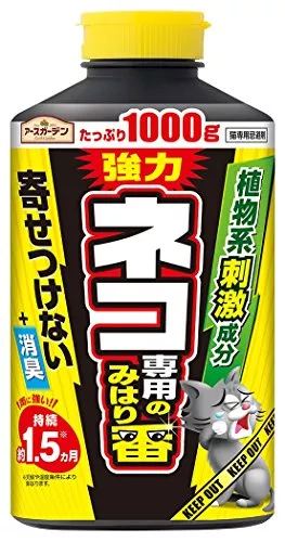 こちらの商品は、猫の嫌がる匂いを放つ粉末タイプのアイテムです。雨に強く約1.5カ月効果が持続し、大容量の1000g入りなので、コストパフォーマンスに優れています。土壌にやさしい天然鉱物使用で庭にも使用可能です。