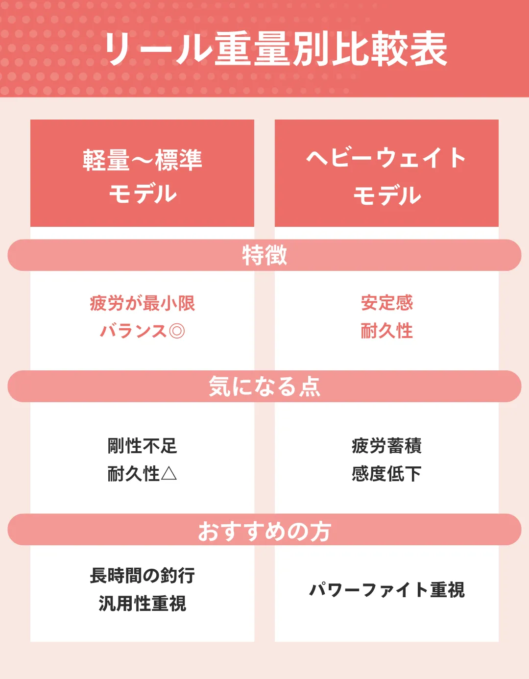 長時間の釣行や感度重視なら軽量モデルを、大物狙いやタフな釣りで剛性を求めるならヘビーウェイトモデルを選びましょう。