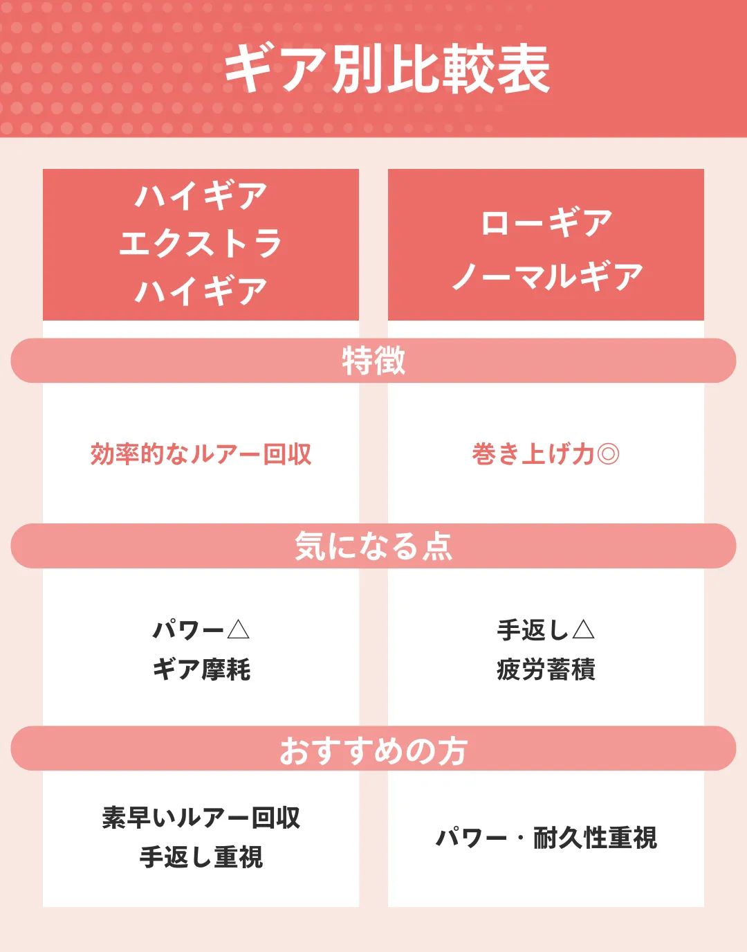 素早いルアー回収や手返し重視ならハイギア、大型魚とのファイトや巻き抵抗が強いルアーを使うならローギアがおすすめです。