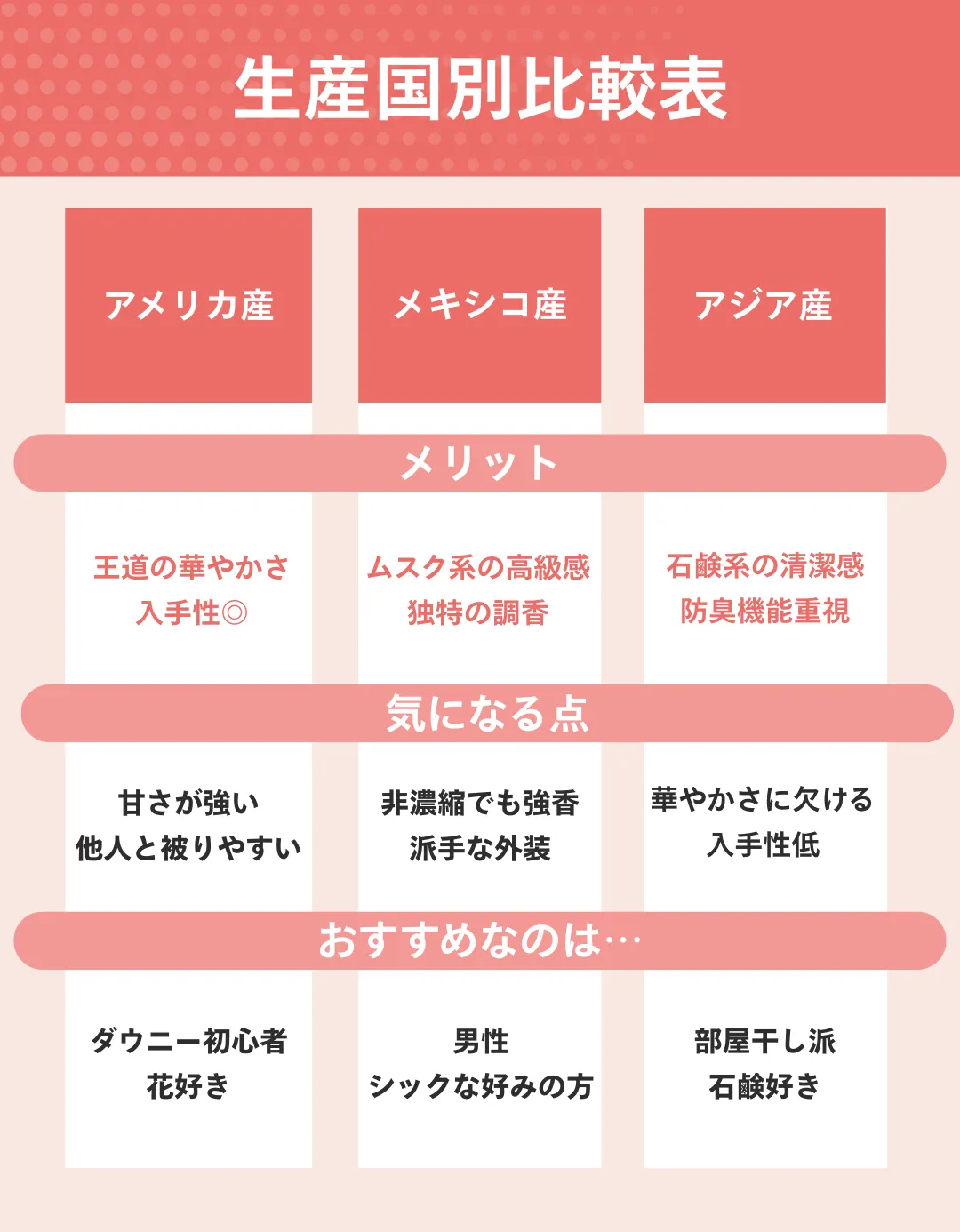 甘め、ムスク系、石鹸系など生産国によって異なる「香りの傾向」