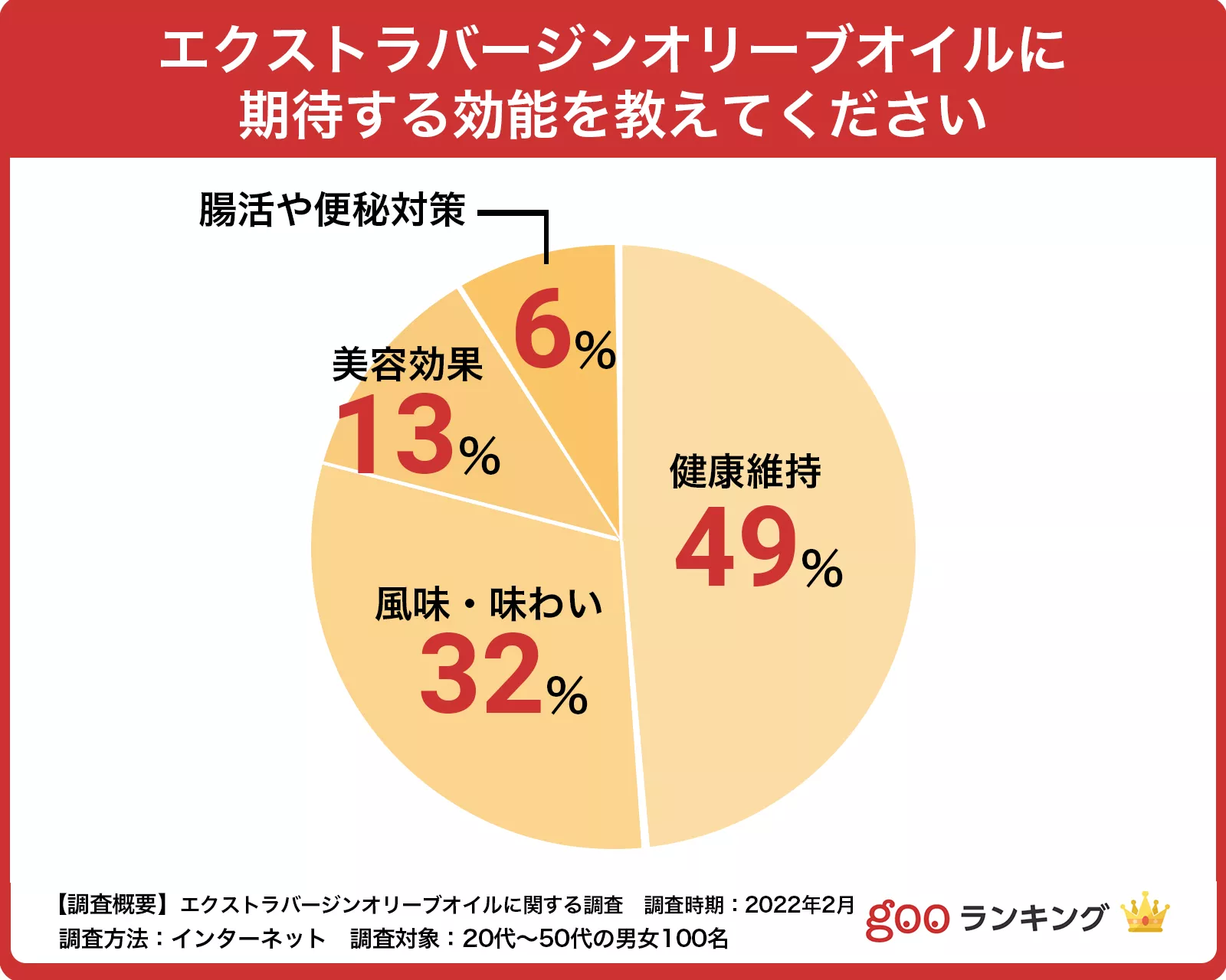 エクストラバージンオリーブオイルに期待する効果についてアンケートを行ったところ、最も多い回答は約半数の方が選んだ「健康維持」でした。また、風味・味わい・美容効果・腸活などと回答した方も多くいます。