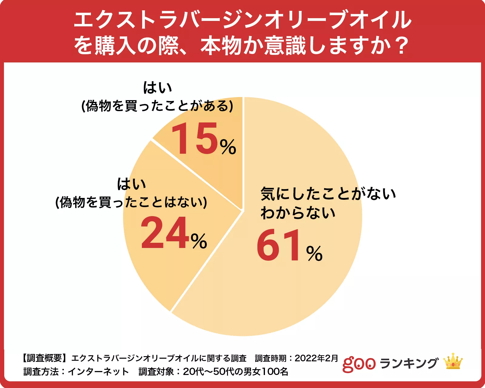 エクストラバージンオリーブオイルを購入する際、本物か偽物か意識するかのアンケートでは約60%の方が「気にしない・分からない」と回答しました。また、偽物を買ってしまった経験があると回答した方も15%と多く、実際に偽物が出回っていると分かります。