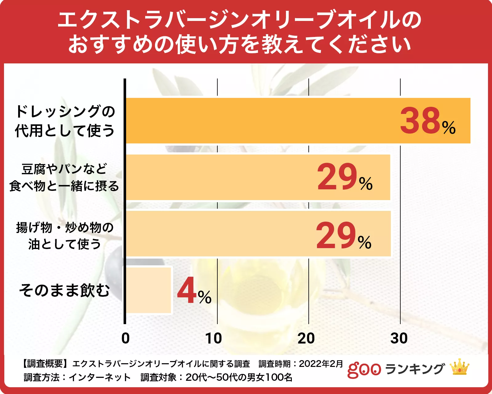 エクストラバージンオリーブオイルの使い方についてアンケートを行ったところ、「ドレッシングの代用として使う」と回答した方が38%で最も多い回答となりました。また、「豆腐やパンと一緒に摂る」「揚げ・炒め油として使う」を選んだ方はいずれも29%です。