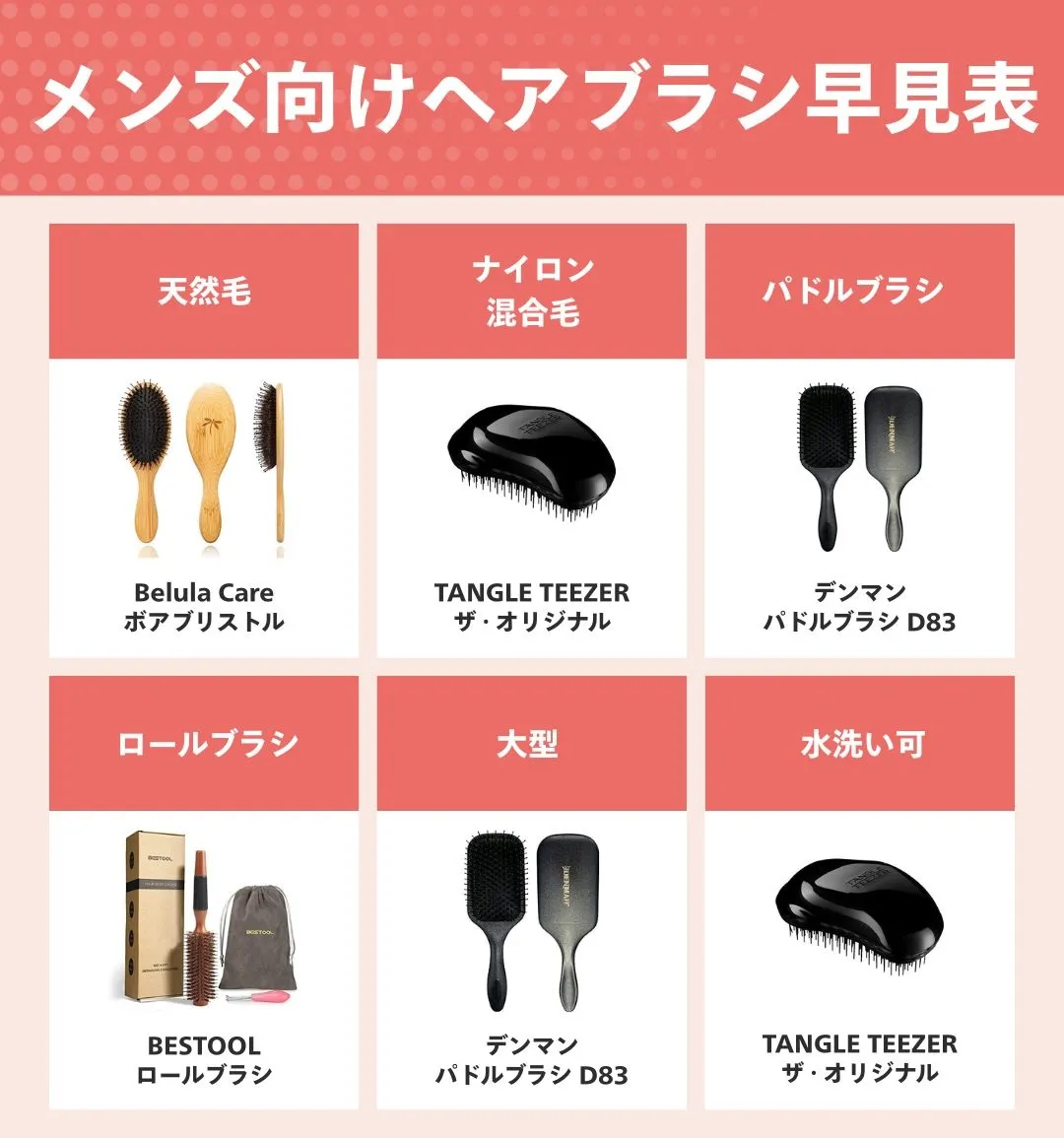 おすすめメンズ向けヘアブラシ早見表はこちら