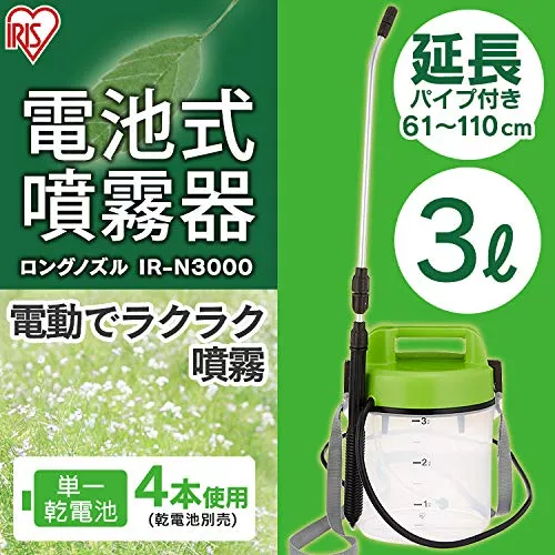 第1位 IR-N3000 アイリスオーヤマ(IRIS OHYAMA) | Amazon楽天ヤフー | リーズナブルでコスパ抜群!アイリスオーヤマの人気小型モデル | 電池式 | 3L | 肩掛け式 | 幅約18×奥行き約15×高さ約26.5 | 61〜83cm(通常)・88〜110cm(延長ホース使用) | 約760g | 約240㏄/分 | ‐ | |