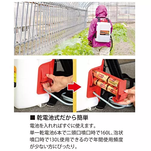 第2位 DK-10D 工進(KOSHIN) | Amazon楽天ヤフー | 消毒にも除草にも!操作が簡単な乾電池式噴霧器で手軽に使える | 乾電池式 | 10L | 背負い式 | 210x310x420mm | ‐ | 3.3kg (アルカリ乾電池含む:4.2kg) | 自在2頭口噴口 (1頭口噴口時): 0.45 L/min・自在2頭口噴口 (2頭口噴口時): 0.68 L/min・カバー付泡状除草噴口: 0.55 L/min・泡状除草噴口: 0.55 L/min | 自在2頭口噴口 (1頭口噴口時): 0.26 MPa (2.6 kgf/cm2)・自在2頭口噴口 (2頭口噴口時): 0.16 MPa (1.6 kgf/cm2)・カバー付泡状除草噴口: 0.22 MPa (2.2 kgf/cm2)・泡状除草噴口: 0.22 MPa (2.2 kgf/cm2) | |