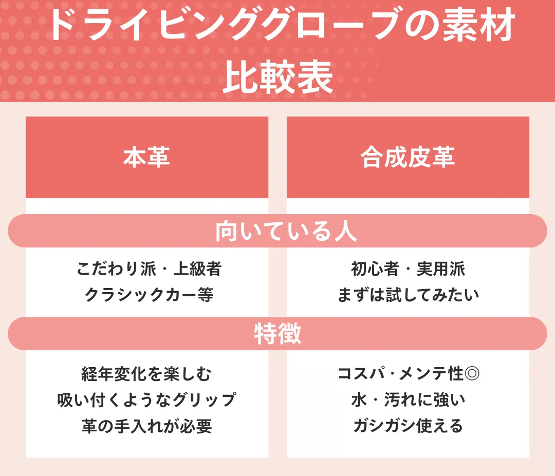 「愛車との一体感を味わいたい」「夏場の日焼けや手汗を防ぎたい」などの使用シーンを明確にすると、選ぶべき商品は自然と絞られてきます。