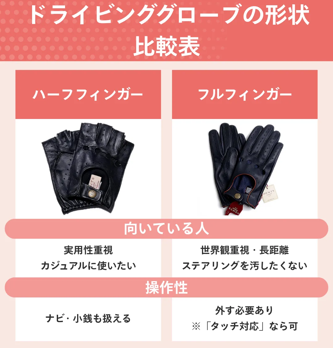 形状は大きく分けてハーフフィンガーorフルフィンガーの2択です。「スマホを触りたい」「ステアリングを汚さないようにしたい」など、つけている最中に行う動作や目的を考えて選んでみましょう。