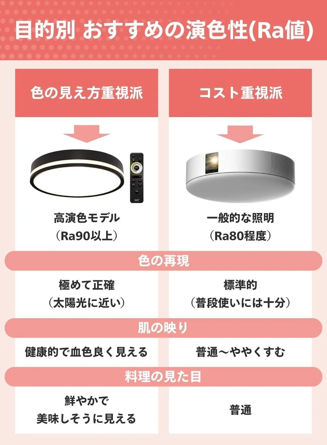 生活空間の質を光の質から改善したいと考える層にとって、色の再現性は妥協すべきではないポイントです。単に明るいだけでなく、対象物を美しく見せるための光は、住まい全体の満足度を静かに、かつ確実に高めてくれます。