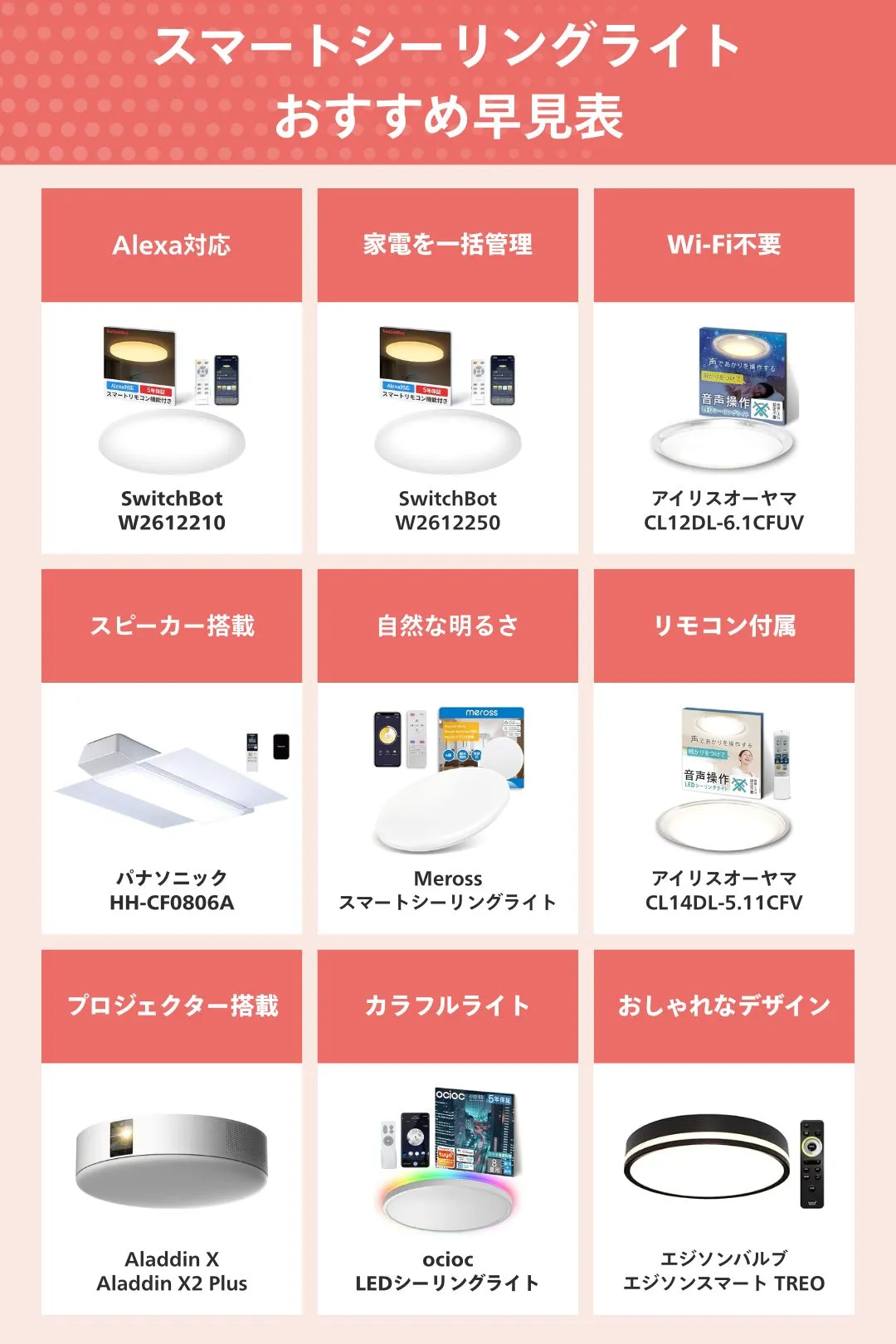 LEDシーリングライトプロ スイッチボット | ![]() | Amazon楽天ヤフー | スマホでエアコンやテレビを操作できるスマートシーリングライト | 6畳 | Wi-Fi接続必要 | AmazonAlexa・Google アシスタント・Siri | 調光◯・調色◯ |