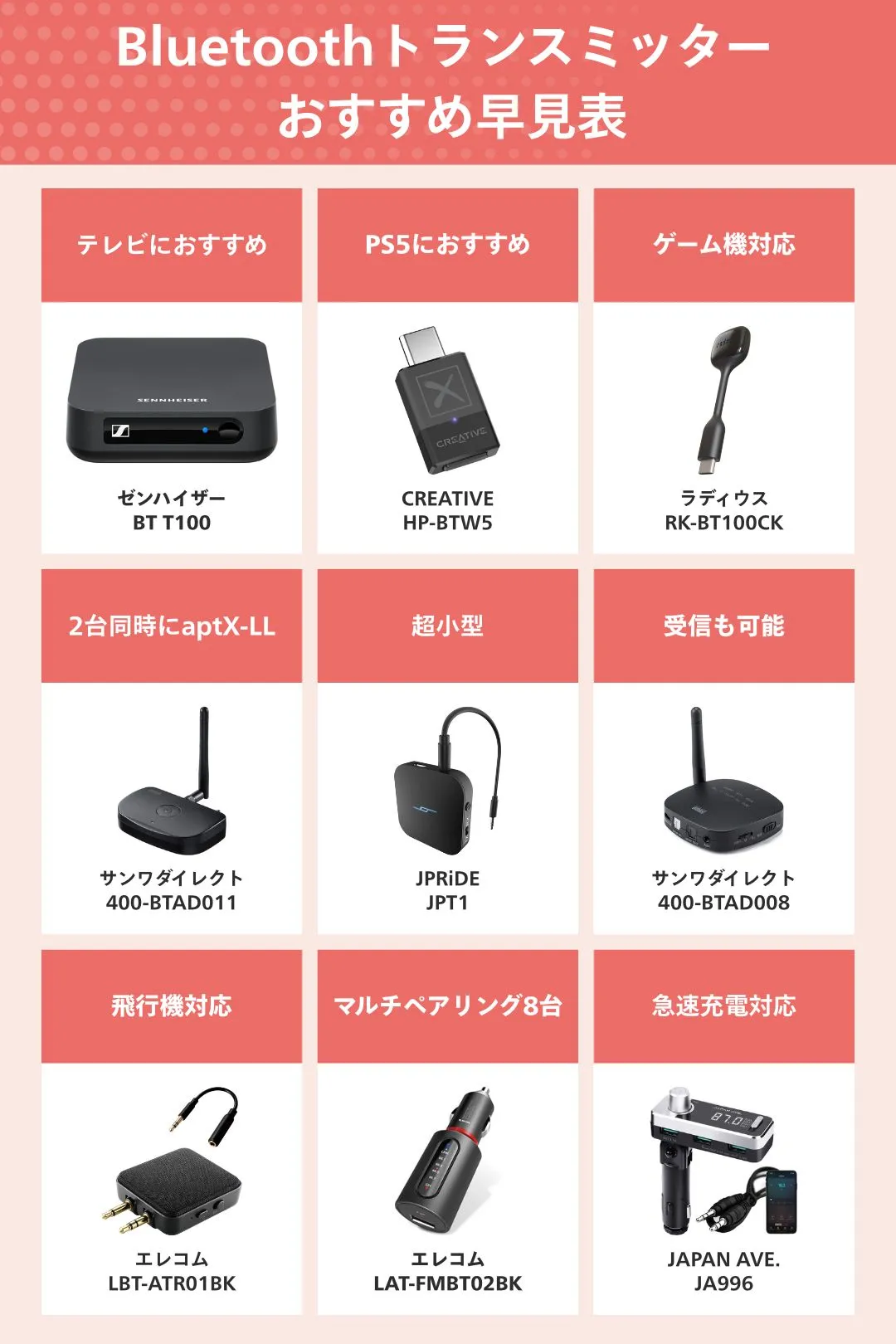 Bluetoothオーディオトランスミッター RK-BT100C ラディウス | ![]() | Amazon楽天 | 2台同時接続可能!充電不要なゲーム向けBluetoothトランスミッター | 5.0 | - | - | 約10m |