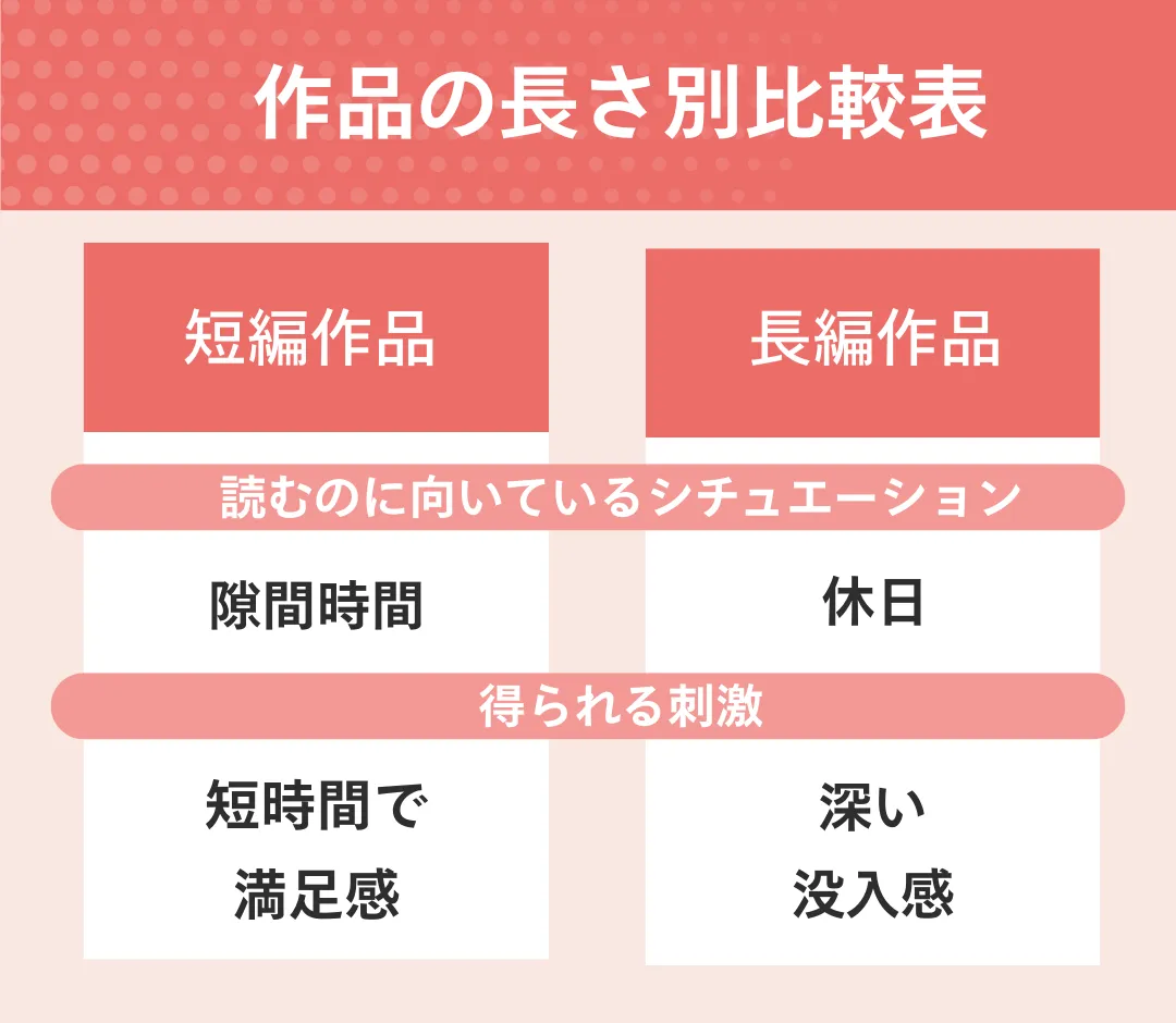 通勤・通学時間などの隙間時間を有効活用したい方や、集中力が続きにくい方に最適です。 1話が5分から15分程度で完結するため区切りが良く、短い時間でも「1冊読み切った」という満足感を得ることができます。