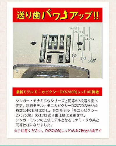 第1位 モニカピクシーDX5760R SINGER | 楽天Amazonヤフー | 耐久性と機能性を重視する方におすすめ | 29.5×41.5×17.2cm | 8kg | アルミ | 縫い模様15種類、自動糸調子、自動糸通し、自動ボタンホール、LED手元ライト、縫い目長さ調節、7枚送り歯、段縫い押えボタン、コードリール | ハードケース、フットコントローラー | |