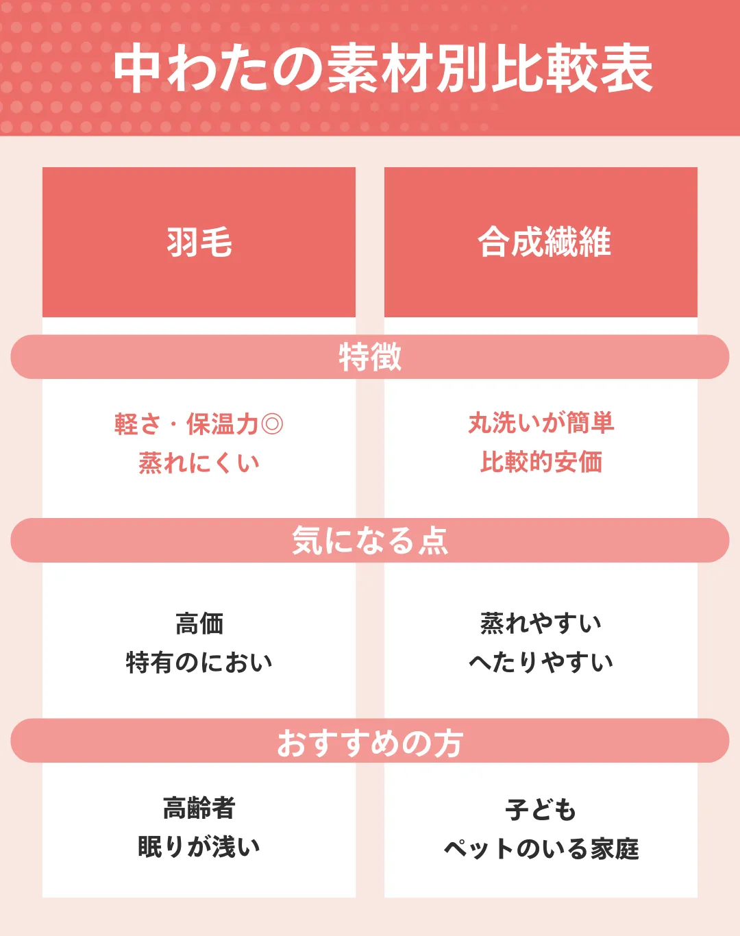 タンブラー乾燥が可能な製品も多く、汚れたらすぐにリセットできるため、小さなお子様やペットと一緒に寝る家庭では、衛生面での安心感が際立ちます。また、羽毛に比べて安価であるため、来客用として複数揃える場合や、短期間での買い替えを前提とする単身者にも向いています。機能性中わたの中には、発熱機能や抗菌機能を付加したものもあり、目的に応じた柔軟な選択が可能です。