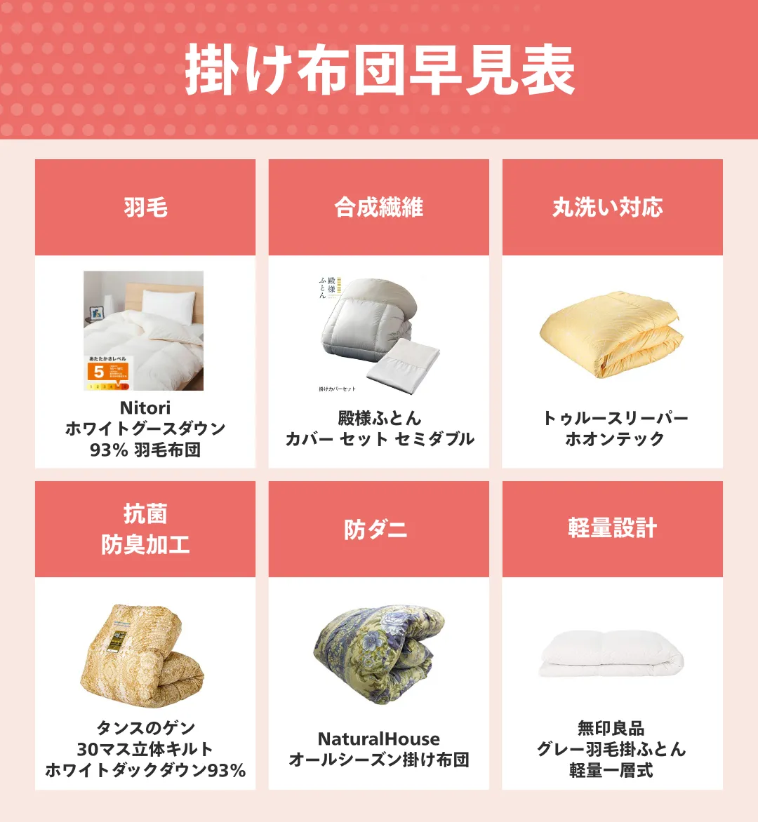 掛け布団は「何を重視するか」を明確にすることで、自分に合った一枚が選べます。掛け布団選びでチェックすべきポイントは、ズバリ以下です。