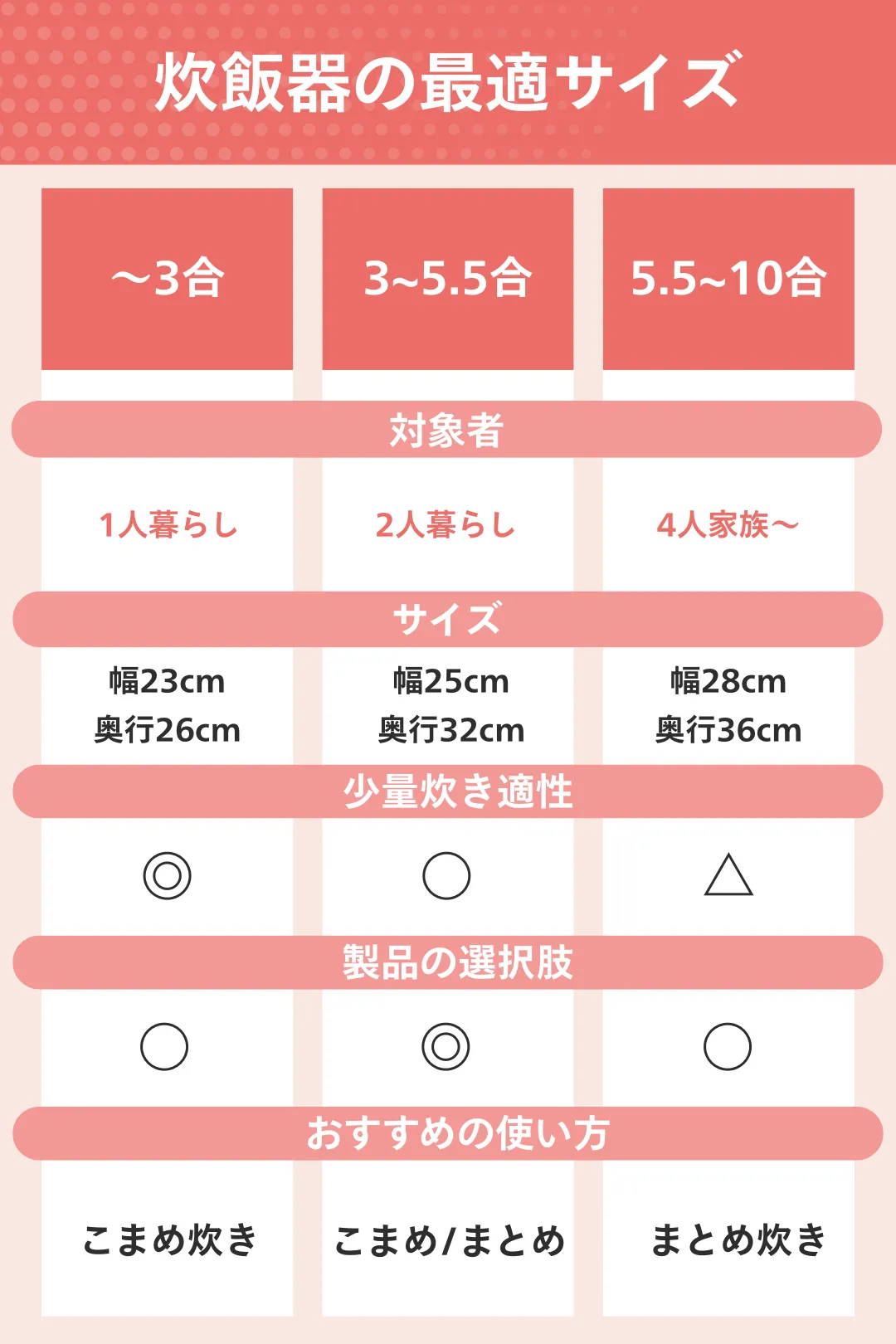 夫婦2人暮らしや2〜3人のご家庭では、3合~5.5合が主流です。育ち盛りのお子様がいる場合や、毎回大量に炊かない場合でも来客時や少し多めに炊きたい時に対応できる余裕があると安心。