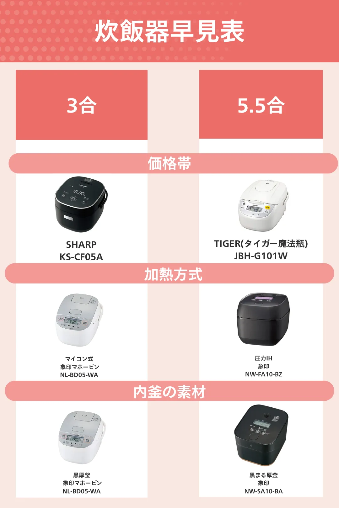 このサイズは各メーカーが最も力を入れているボリュームゾーンであり、選択肢が多く、少量炊きでも性能が発揮されるモデルを選びやすいのも特徴です。