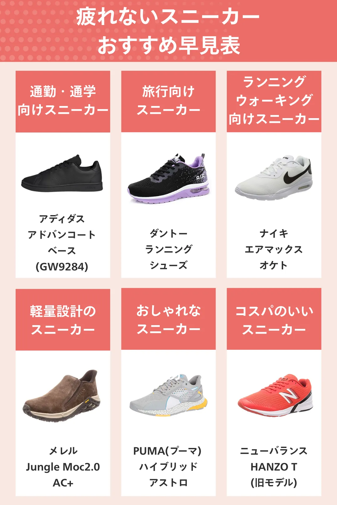スニーカー選びでまず確認したいのは、いつ・どこで・どれくらい履くかです。通勤や通学なら軽さと耐久性、立ち仕事ならクッション性と安定感、旅行には軽量で汎用性の高いモデルが適しています。