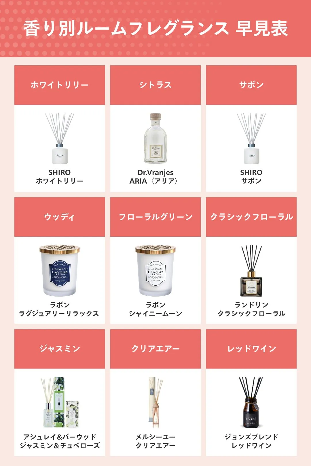 実はルームフレグランスや芳香剤は、家のリビングや玄関・寝室など置く場所によって向いている香りが異なるのがポイントです。フローラル系・シトラス系・グリーン系などさまざまな香りの中から、場所のイメージに合ったものを選びましょう。