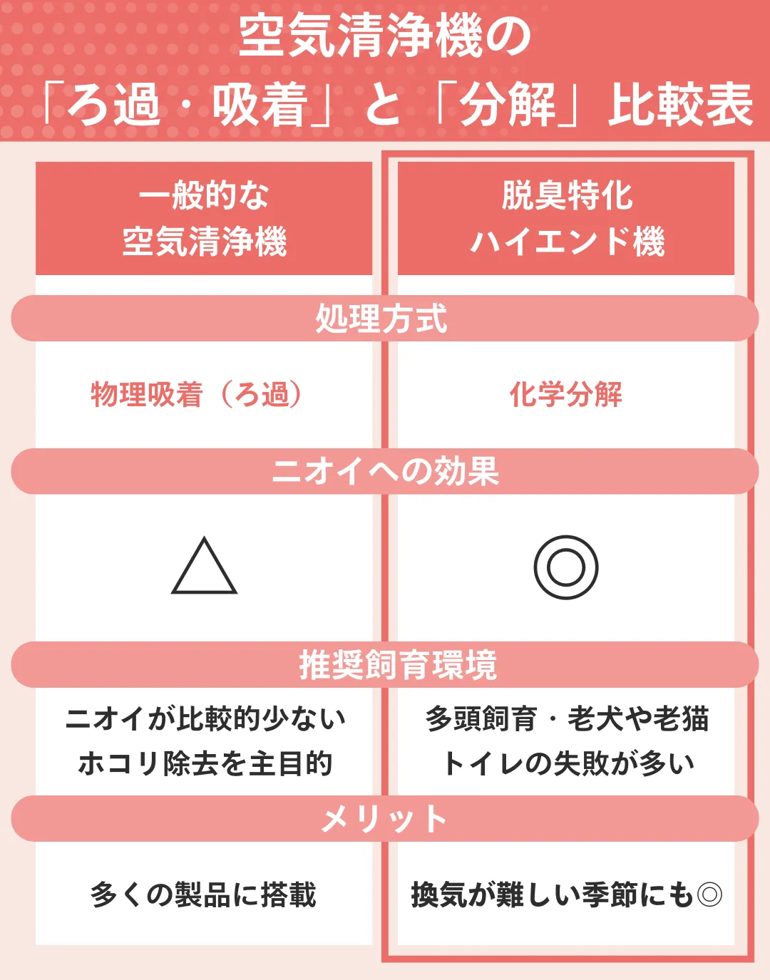 空気清浄機における脱臭機能には、フィルターで物理的にニオイを吸着する方式と、化学反応で分解する方式の二種類が存在します。ペット臭の主成分であるアンモニアやトリメチルアミンなどの強いニオイは、通常の活性炭フィルターではすぐに飽和してしまい、効果が長続きしないことがあります。対して、オゾン発生器や光触媒フィルターを搭載した脱臭特化型の機種は、ニオイの分子構造を破壊し、無臭化することを目指して設計されています。