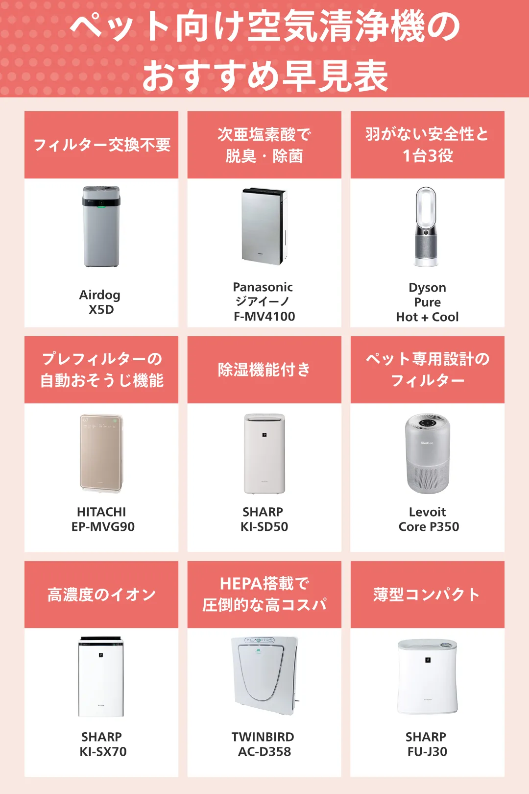 ペット向け空気清浄機は「何を重視するか」を明確にすることで、自分に合った一台が選べます。ペット向け空気清浄機選びでチェックすべきポイントは、ズバリ以下です。