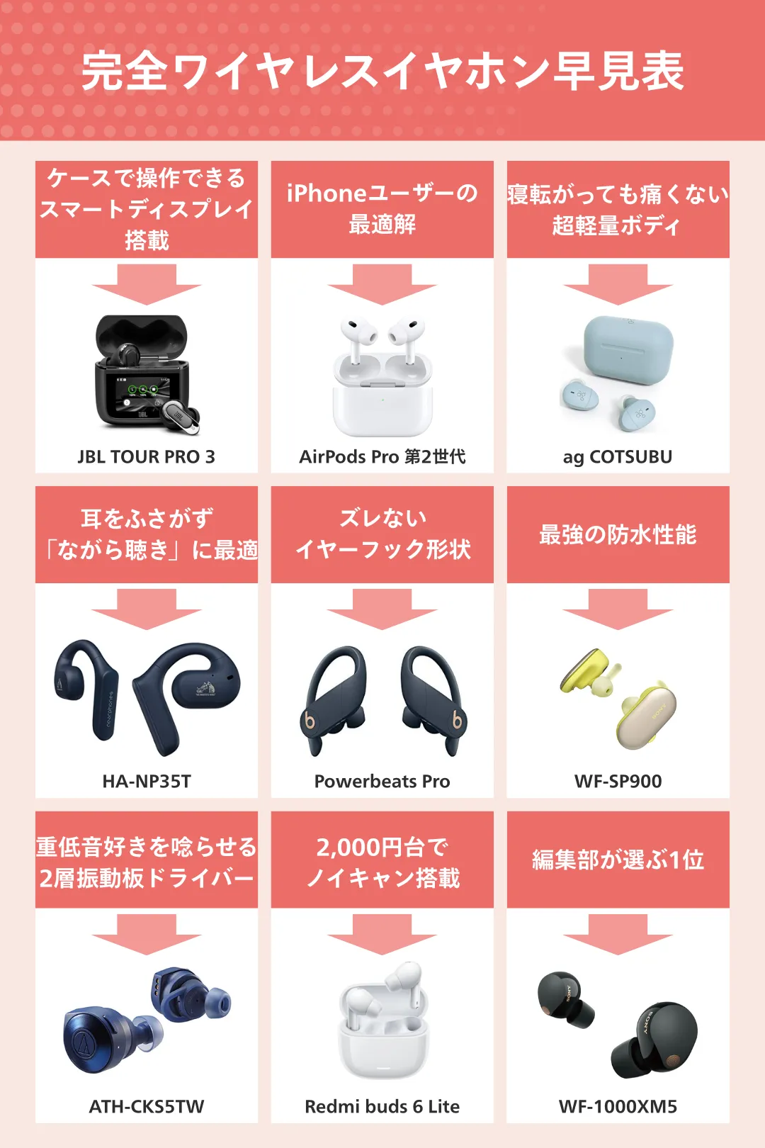 一方、3万円は手が出ない方も「何を重視するか」を明確にすることで、自分に合った一台が選べます。完全ワイヤレスイヤホン選びでチェックすべきポイントは、ズバリ5点です。