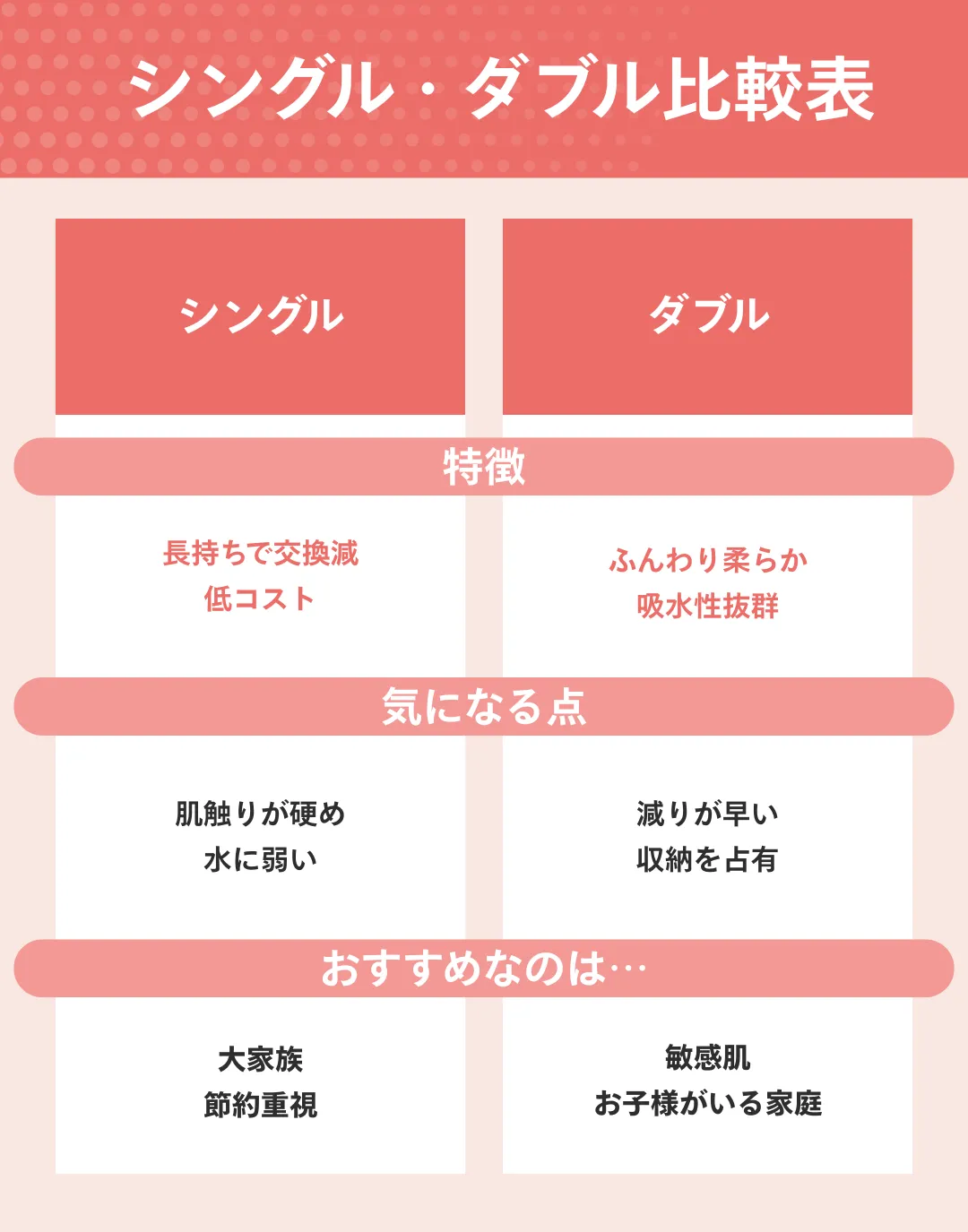 「シャワートイレ後の水分をしっかり拭き取りたい」「敏感肌なのでとにかく摩擦を減らしたい」などの使用シーンを明確にすると、選ぶべき商品は自然と絞られてきます。