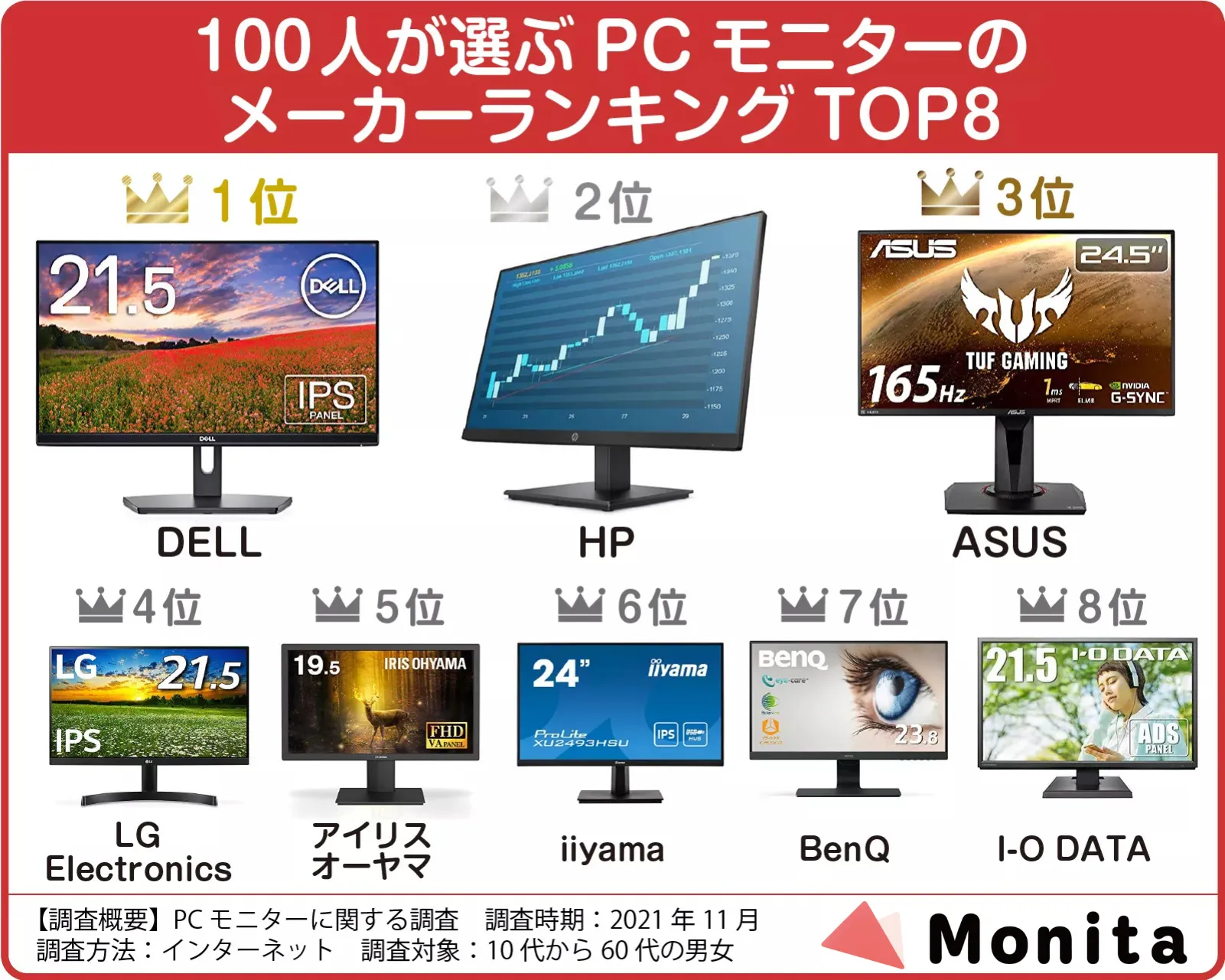 PCモニターのメーカーについて100人にアンケート調査を実施したところ、DELLやHPなどが人気でした。DELLは高性能かつ高コスパで使い勝手のいいモニターが多く、種類も豊富で好みのものを選べます。
