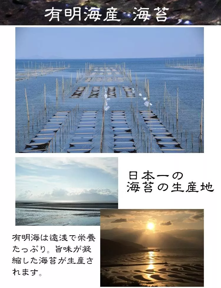 有明海と言えば、国内でも有数ののりの養殖地としても知られています。全国で生産されるのりの量も、半分以上が有明海産です。香りが豊かで口どけも滑らか、とろけるような甘みで喉ごしが良いのが特徴になります。