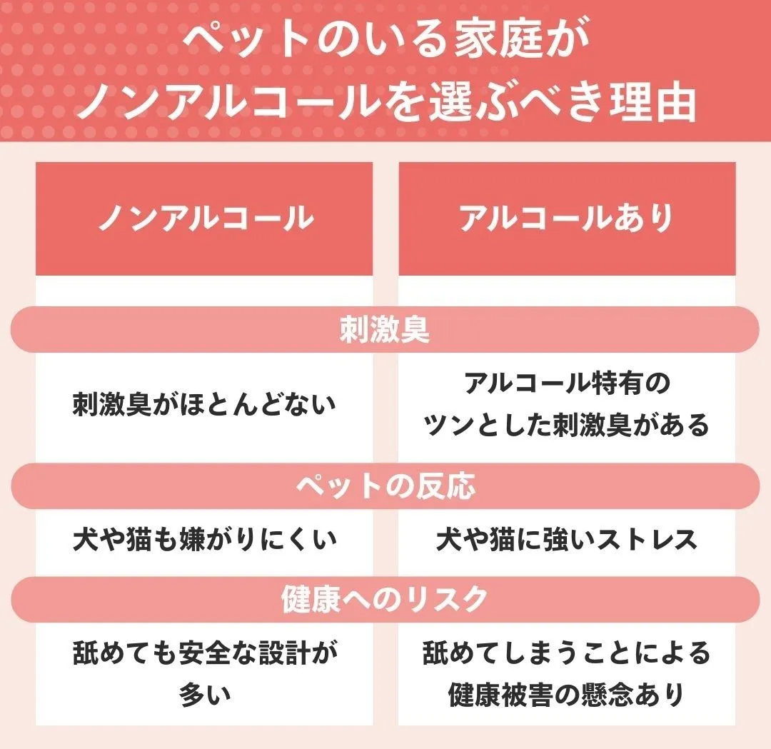 消臭成分に植物抽出物や銀イオンなどが使われているタイプは、自然に近い形で不快なニオイを中和します。家族の一員である動物を含めた全員が安心して過ごせるリビング環境を作るために、ノンアルコール処方は欠かせない条件です。