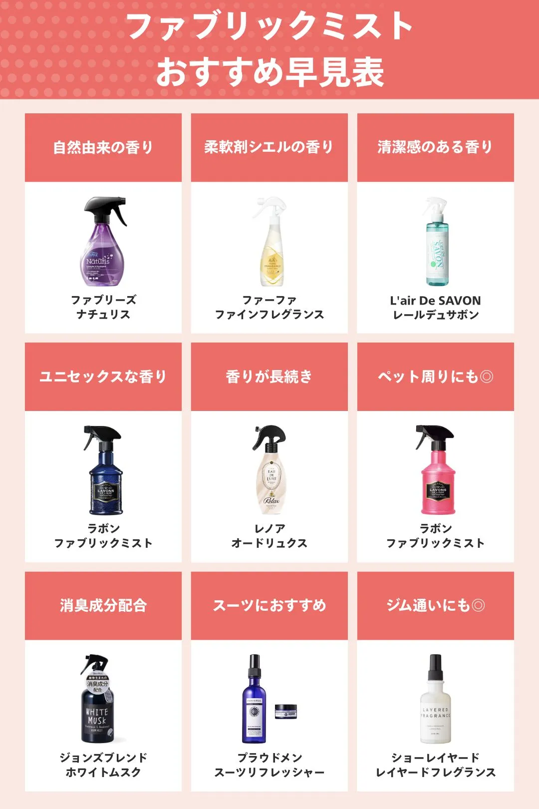 ファブリックミストの中には、ルームフレグランス・ルームスプレーや服につける消臭スプレーとして使える商品もあります。また、ホワイトムスクやサボンなど女子ウケ・男ウケするいい匂いの種類も豊富で、どれがいいか悩む方も多いですよね。