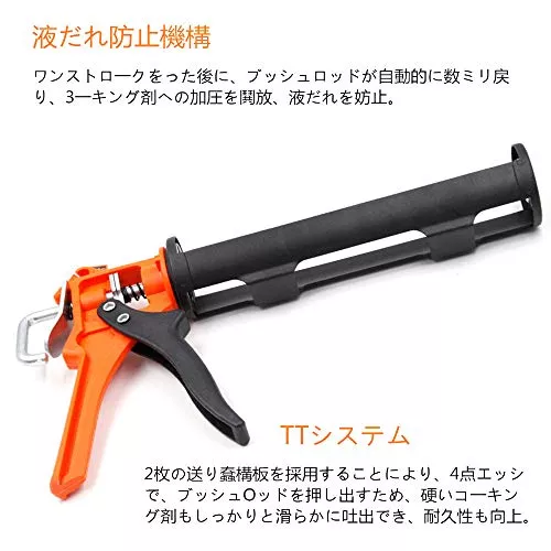 非常にシンプルでスタンダードな押し出し式のコーキングガンです。価格も安くお試しに使用してみたいという方からも高評価を得ています。コーキング剤などが詰まった場合に便利な掃除棒が付いている点もおすすめのポイントです。