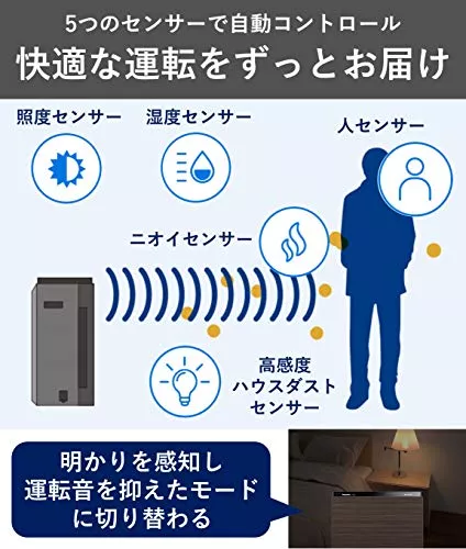 パナソニック空気清浄機は高精度ハウスダストセンサー・ひとセンサー・においセンサー・湿度センサー・照度センサーの5つのセンサーを搭載。微細な汚れも逃さず、状況に応じた適切な運転でより快適に過ごせます。