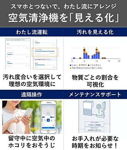 F-VXU90などのプレミアムモデルでは、スマホアプリと連動し遠隔操作・お手入れ時期の表示・自分好みの運転設定登録などが可能です。パナソニックのエアコン「エオリア」と連携しており、アプリから暖房と加湿の運転指示が送ることもできます。